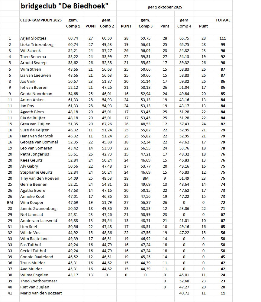 Met de eindstand na 6 competities verdien je punten. A-lijn: nummer 1 krijgt 28 punten, nr. 2 krijgt 27 punten, enz. B-lijn: nummer 1 krijgt 26 punten, nr. 2 krijgt 25 punten, enz
